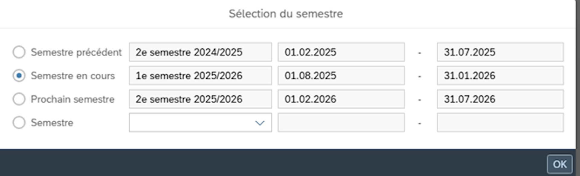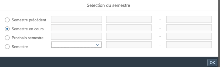 Comme les données SAP doivent être livrées à la CACEB plus tôt que d’habitude cette année (03.12.2025), les modifications concernant le 2e semestre 2023-2024 et le 1er semestre 2024-2025 ne peuvent être saisies et enregistrées que jusqu’au 30 novembre 2025. À compter du 1er décembre 2025, les semestres postérieurs au 1er février 2025 (2e semestre 2024-2025) pourront être traités sans restriction.
