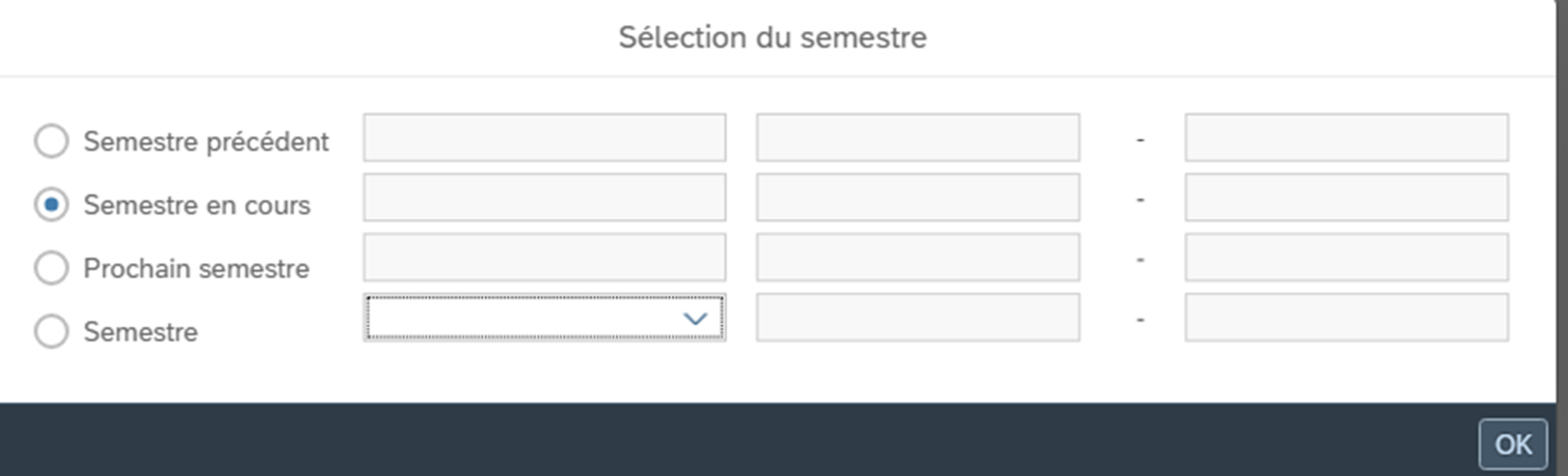 Pour l’application relative aux leçons ponctuelles, nous pouvons déjà indiquer directement en ligne, au moyen d’un avertissement, quand la saisie sera bloquée. Ce n’est pas encore possible pour SAP-CdPe. Nous devons donc actuellement y supprimer temporairement la sélection du semestre, en guise de solution alternative.