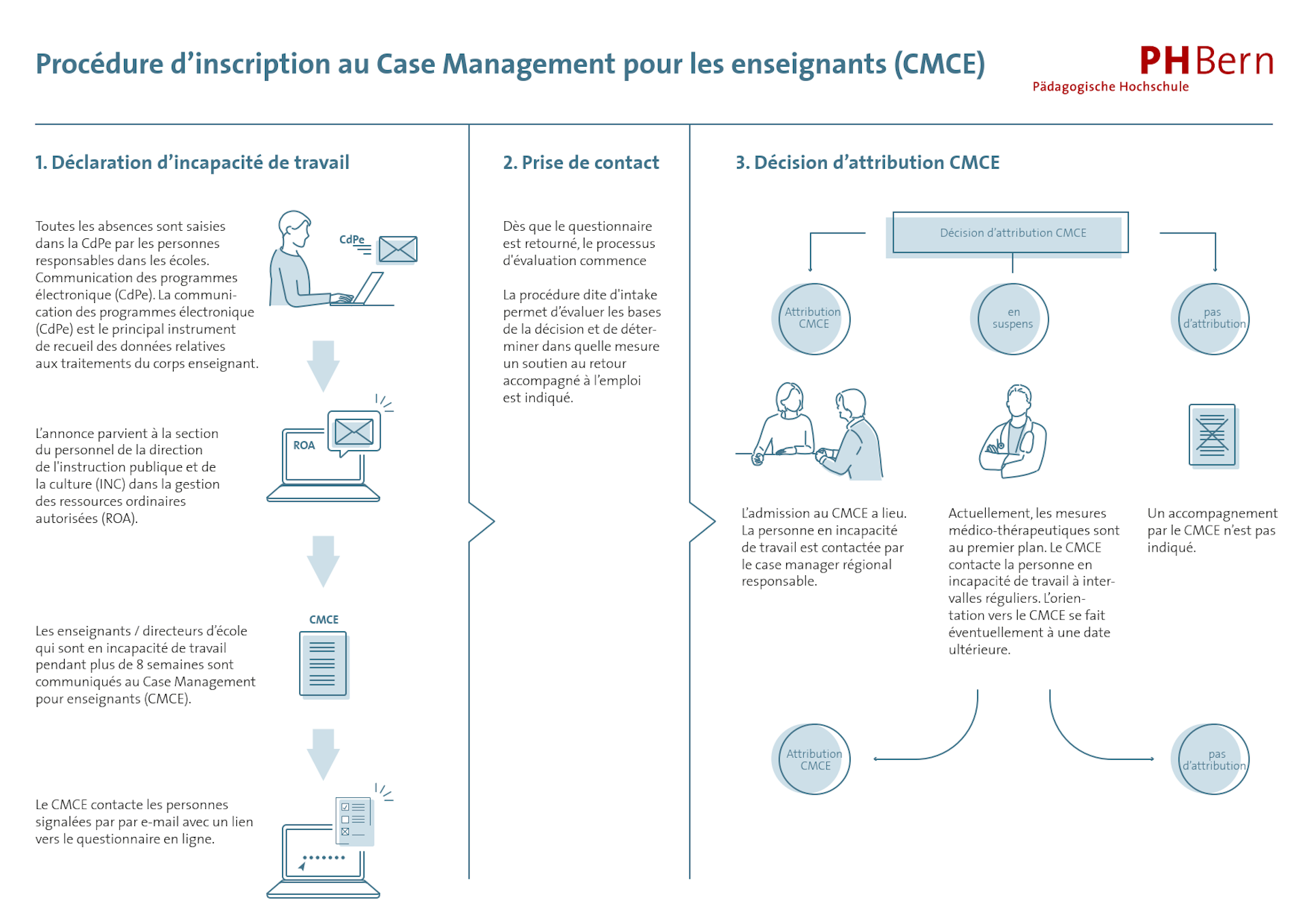 Après avoir reçu l’annonce d’absence, le Case management prend contact par courriel avec l’enseignante ou l’enseignant concerné. Dans ce courriel, l’enseignante ou l’enseignant reçoit un lien personnalisé vers le questionnaire à remplir en ligne. Le processus d’évaluation débute dès que le Case management reçoit le questionnaire dûment rempli. Dans un premier temps, on examine et évalue dans quelle mesure il serait judicieux de mettre en place un suivi avec le Case management. Si tel est le cas, une ou un case manager prend contact avec l’enseignante ou l’enseignant dans les 14 jours suivant la réception du formulaire.