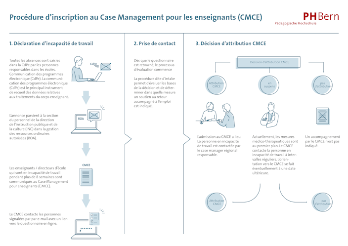 En cas d’absence de longue durée, les enseignantes, les enseignants et les membres des directions d’école peuvent bénéficier d’un Case management. L’objectif du Case management est d’accompagner et de soutenir précocement une personne en arrêt maladie afin de favoriser une réinsertion professionnelle rapide.