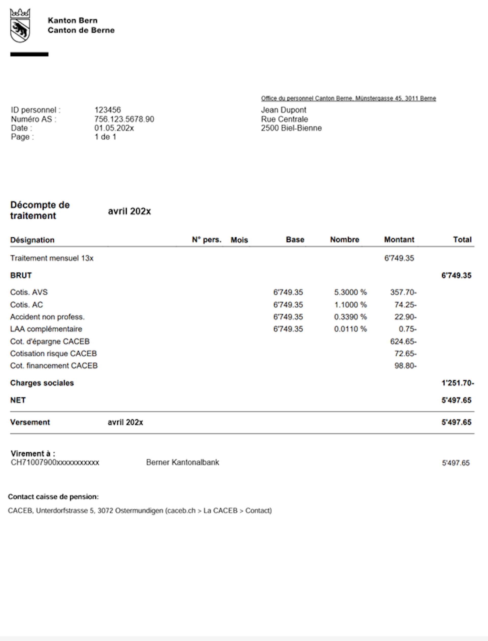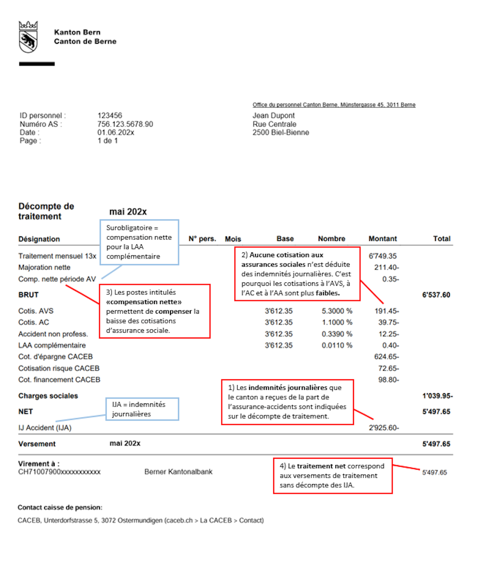En cas d’incapacité de travail à cause d’un accident d’une enseignante ou enseignant ou d’une directrice ou directeur d’école, le canton de Berne continue de verser le traitement. À cet effet, il reçoit des indemnités journalières de la part de l’assurance-accidents. Il reçoit également des indemnités journalières de la part de la caisse de compensation dans les cas de service civile et militaire, de congé de maternité et de paternité et enfin dans les cas de congé de prise en charge d’un proche. Étant donné que toutes les indemnités journalières ne sont pas soumises à l’AVS, aucune déduction AVS, AC, AA et AA complémentaire n’est effectuée sur ces indemnités. Afin que le salaire net de la personne absente ne soit pas plus élevé qu’en temps normal en raison de l’absence de telles déduction, il fait l’objet d’une compensation nette après réception des indemnités journalières. Pour plus d'informations, cliquez ici.