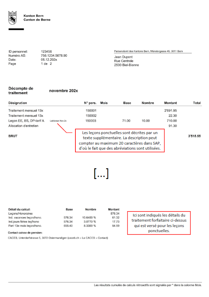 Dans certains cas, il peut arriver que deux décomptes de traitement soient envoyés le même mois parce que le décompte de traitement est établi deux fois, une première fois au milieu du mois (traitement mensuel) et une seconde fois à la fin du mois (salaires horaires, corrections). Dans un tel cas, le second décompte remplace le premier établi au milieu du même mois, étant donné que SAP ne permet qu’un seul décompte par mois.