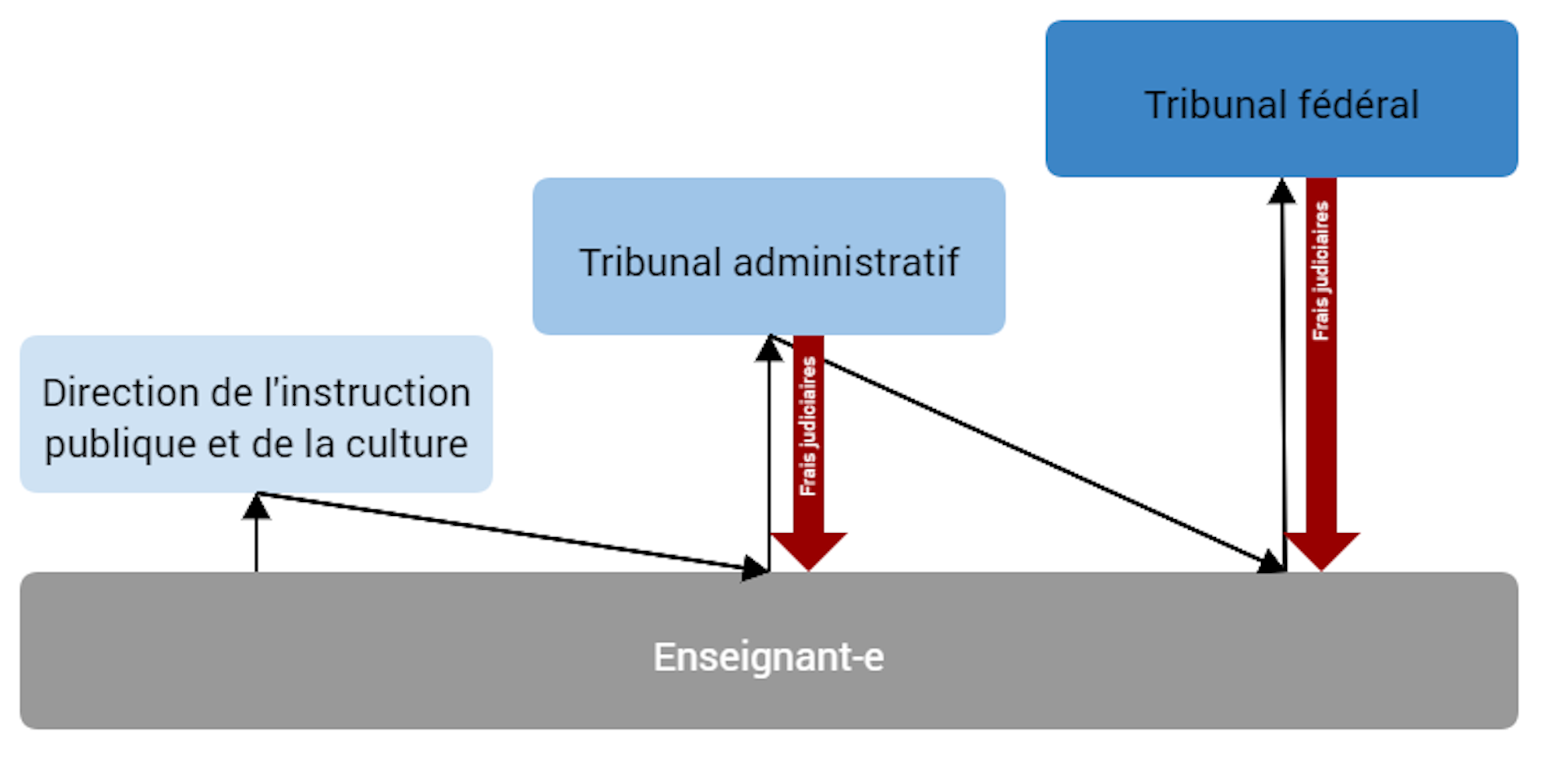 La procédure de recours se déroule selon une réglementation légale. Si le recourant ou la recourante obtient gain de cause, la Section du personnel (SPe) adapte la décision en conséquence. Les procédures concernant des questions de droit du personnel sont gratuites pour les enseignants et enseignantes. Si l’INC rejette le recours, l’enseignant ou l’enseignante peut s’adresser à l’instance supérieure, mais les frais correspondants seront alors à sa charge (cf. illustration).