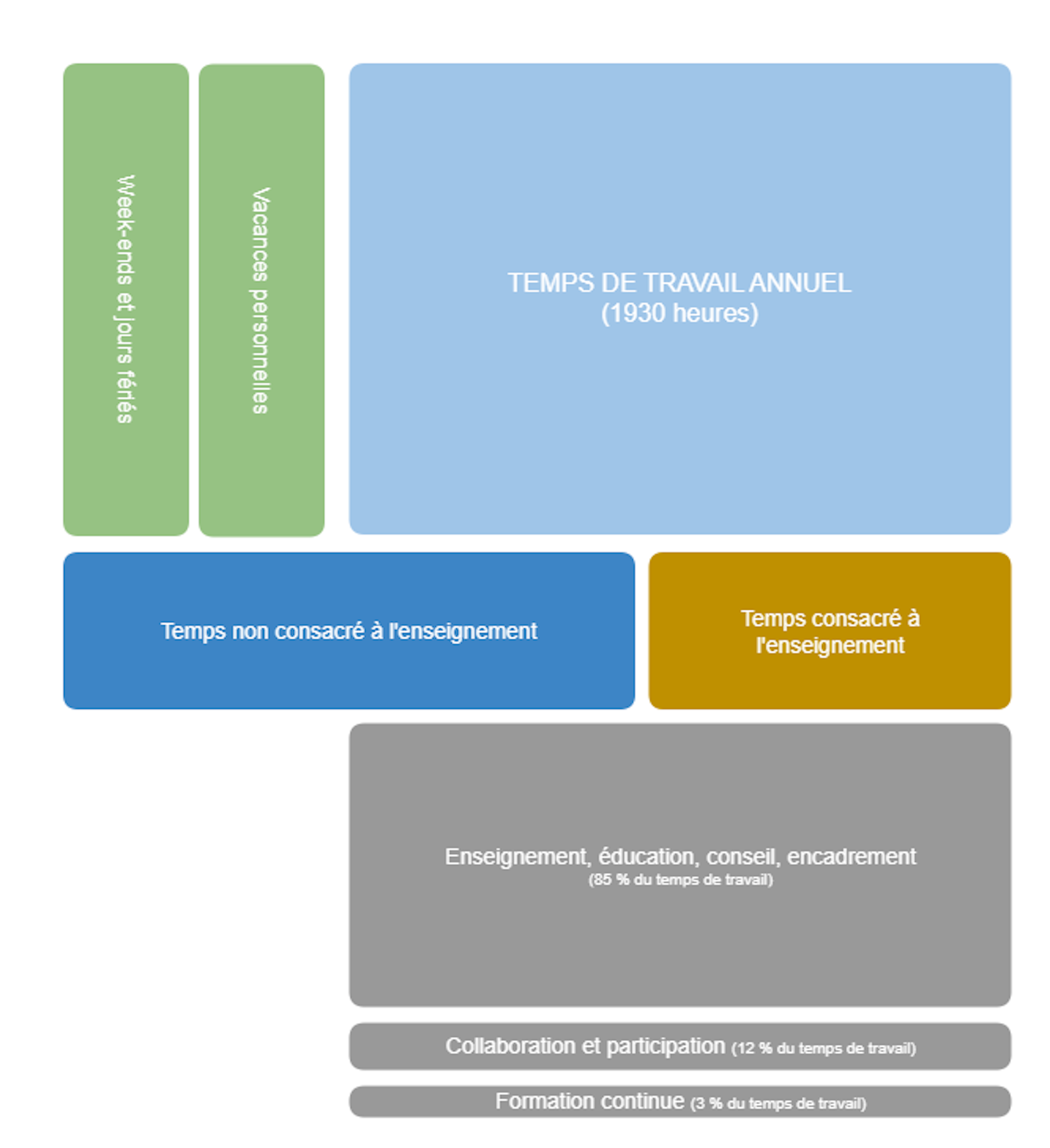 Pour le calcul du temps de travail annuel, la règle suivante s’applique : dès qu’une enseignante ou un enseignant se met au travail le matin (photocopie, préparation du matériel, installation de la salle, corrections, entretiens, etc.), le temps de travail débute. Les pauses sont elles aussi considérées comme étant du temps de travail. La pause de midi (repas) ne compte pas comme temps de travail. Le temps non consacré à l’enseignement est également considéré comme étant du temps de travail (85 % consacrés à l’enseignement, l’éducation, le conseil et l’encadrement – 12 % à la collaboration et à la participation – 3 % à la formation continue).