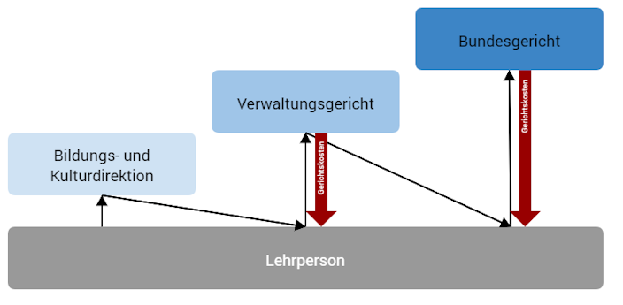 Das Beschwerdeverfahren folgt einem rechtlich vorgeschriebenen Prozess. Sollte die Beschwerdeführende oder der Beschwerdeführende recht erhalten, nimmt die Abteilung für Personaldienstleistungen (APD) die entsprechende Korrektur der Verfügung vor. Das Verfahren in personalrechtlichen Angelegenheiten ist für die Lehrperson kostenlos. Bei einer Ablehnung der Beschwerde durch die BKD, kann die Lehrperson die Beschwerde kostenpflichtig an die nächsthöhere Instanz weiterziehen (siehe Abbildung).