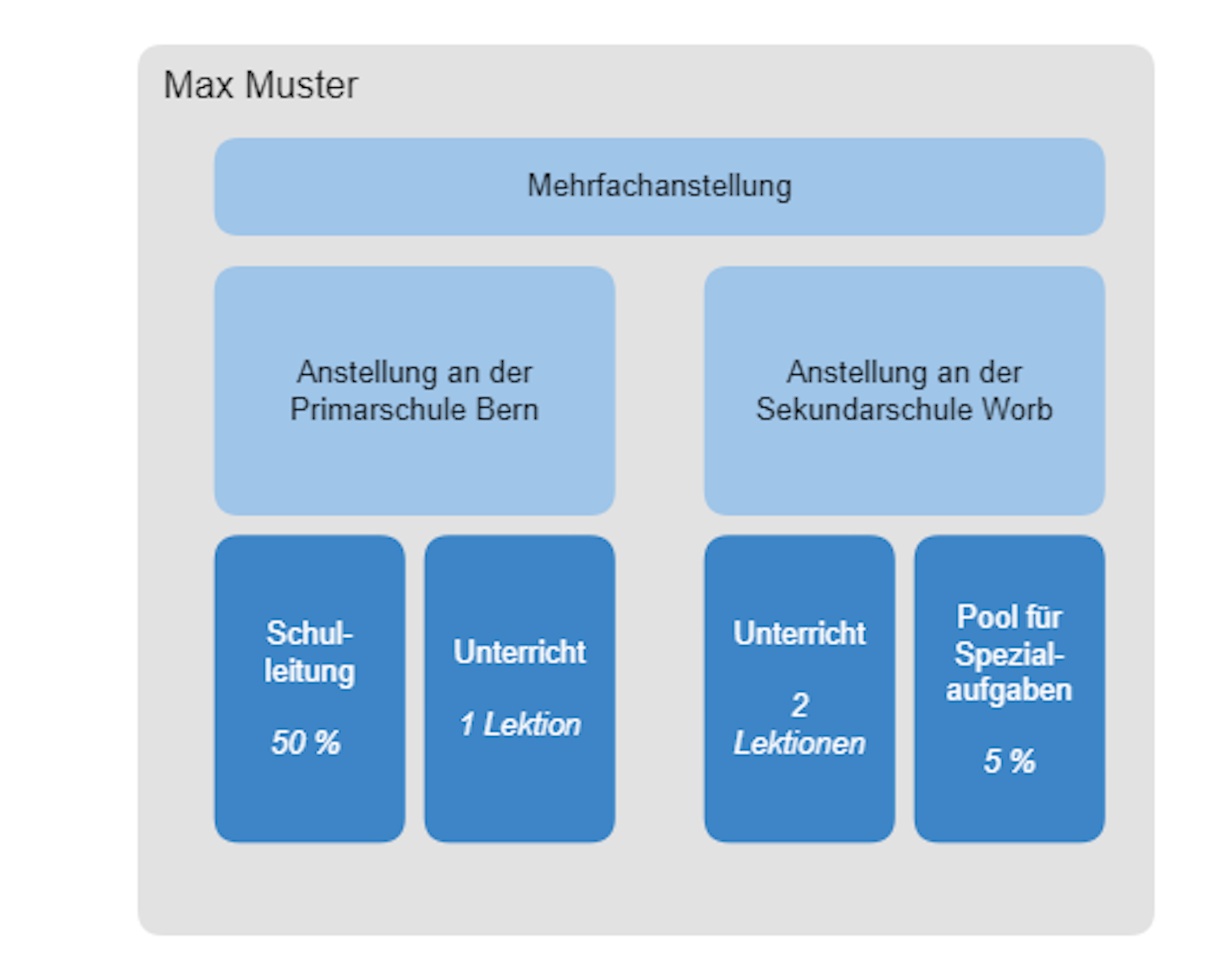 Hat eine Lehrperson mehrere Anstellungen erhält sie pro Anstellung eine Anstellungsverfügung. Sind sämtliche Anstellungen beim Kanton Bern werden diese einzeln, jedoch auf derselben Gehaltsabrechnung aufgeführt.