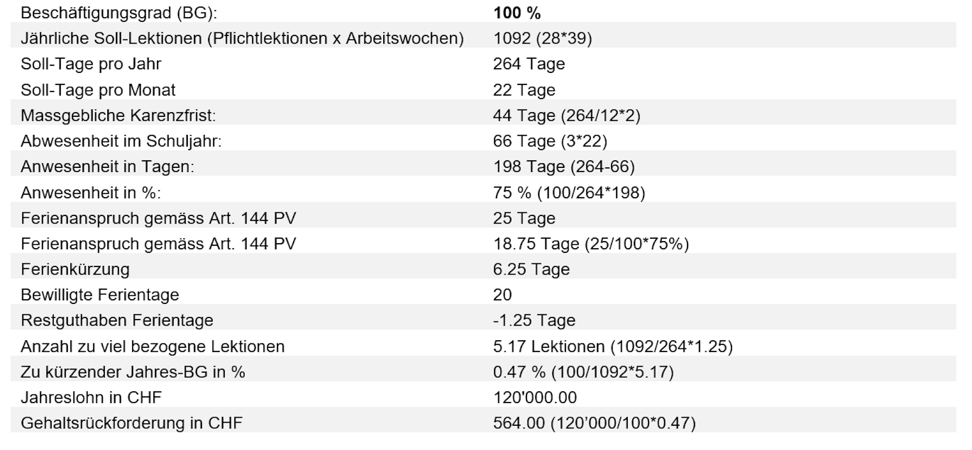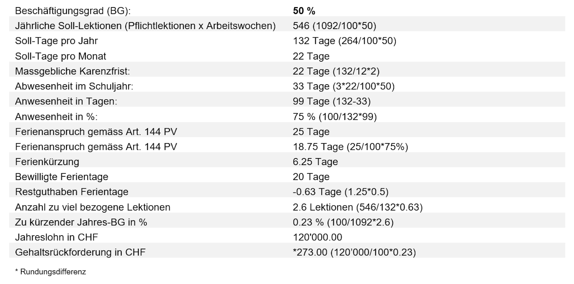 Eine Lehrperson mit einem Pensum von 50 % war innerhalb eines Schuljahres während drei Monaten zu 100 % krankgeschrieben. Während des Schuljahres bezog sie 20 Ferientage.